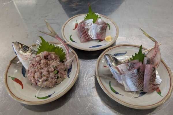 その見事な包丁さばきと手際の良さで、あっという間にアジがお店で出てくるような刺し盛に姿を変えていきます。